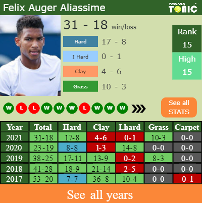 Felix has an aggregate 31-18 win-loss record in 2021, 17-8 on hard (See FULL STATS).