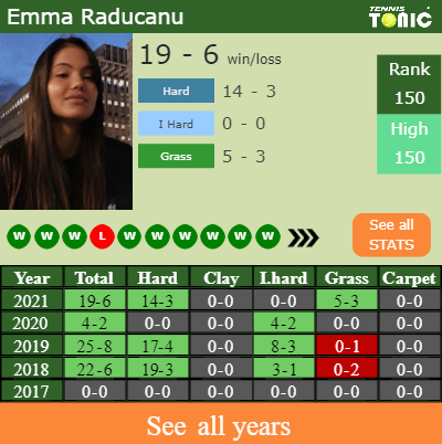 Raducanu has a composed 19-6 win-loss record in 2021, 14-3 on hard (See FULL STATS).