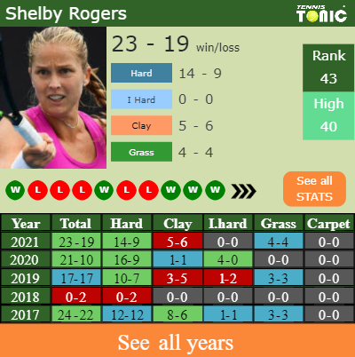 Rogers has a positive win-loss record in the last 10 years having won 55% of her matches (223-182). 14-9 on hard in 2021. In connection with her performance on the same surface of this tournament, Rogers has an overall 119-89 win-loss record in the last years on hard.