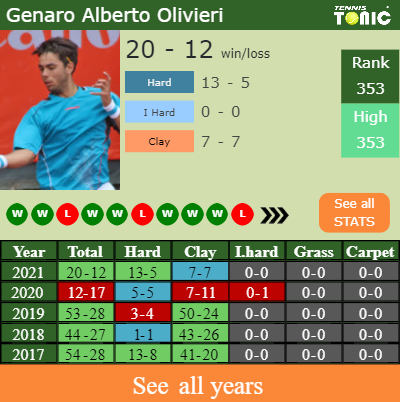 Genaro has an aggregate 20-12 win-loss record in 2021, 7-7 on clay (See FULL STATS).