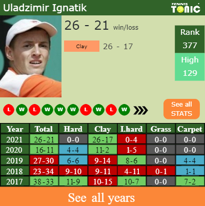 Ignatik has a winning win-loss record in the last 10 years having won 56% of his matches (355-275). 26-17 on clay in 2021. Regarding his performance on the same surface of this competition, Ignatik has an aggregate 173-118 match record in the last years on clay.