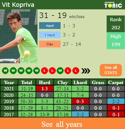 Kopriva has an overall 31-19 win-loss record in 2021, 27-14 on clay (See FULL STATS).