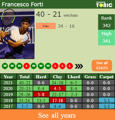 Forti has a composed 40-21 win-loss record in 2021, 34-16 on clay (See FULL STATS).