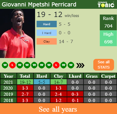 Giovanni has a compiled 19-12 win-loss record in 2021, 5-5 on hard (See FULL STATS).