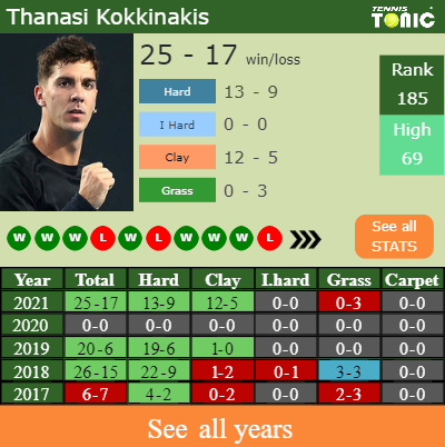 Thanasi has a composed 25-17 win-loss record in 2021, 13-9 on hard (See FULL STATS).