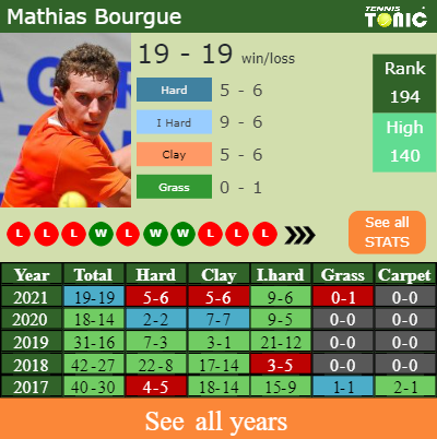 Mathias has a composed 19-19 win-loss record in 2021, 5-6 on hard (See FULL STATS).