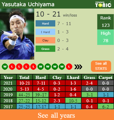 Uchiyama has an overall 10-21 win-loss record in 2021, 7-11 on hard (See FULL STATS).
