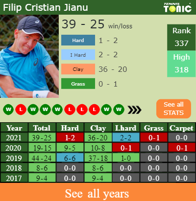 Cristian has an overall 39-25 win-loss record in 2021, 36-20 on clay (See FULL STATS).