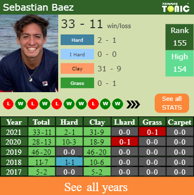 Baez has an overall 33-11 win-loss record in 2021, 31-9 on clay (See FULL STATS).