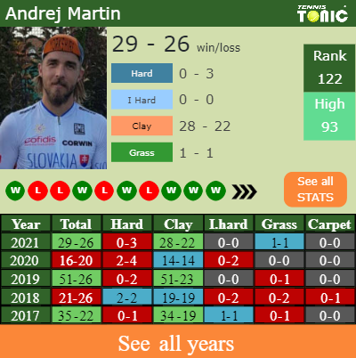 Martin has a composed 29-26 win-loss record in 2021, 28-22 on clay (See FULL STATS).