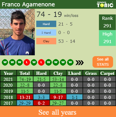 This will be the 2nd time that Sebastian Baez and Franco Agamenone play each other. The head to head is 1-0 for Baez (see full H2H stats), 1-0 on clay.