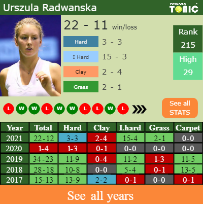 Urszula has a compiled 22-12 win-loss record in 2021, 3-3 on hard (See FULL STATS).