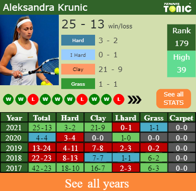 Krunic has a compiled 25-13 win-loss record in 2021, 3-2 on hard (See FULL STATS).