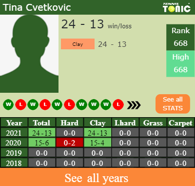 Tina has a composed 24-13 win-loss record in 2021, 0-0 on hard (See FULL STATS).
