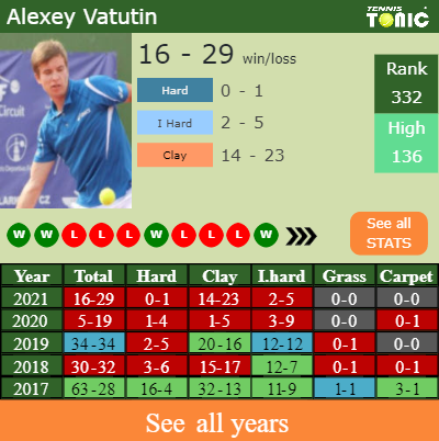 Vatutin has a good win-loss record in the last 10 years having won 59% of his matches (387-268). 14-23 on clay in 2021. In connection with his performance on the same surface of this tournament, Vatutin has an overall 198-142 match record in the last years on clay.