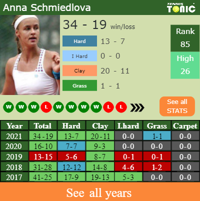 This will be the 2nd time that Anna Schmiedlova and Zarina Diyas face off. The head to head is 1-0 for Diyas (see full H2H stats), but they have never played each other on indoor hard courts.