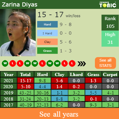 Diyas has an aggregate 15-17 win-loss record in 2021, 0-0 on indoor hard courts (See FULL STATS).