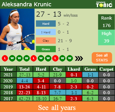 Krunic has a winning record in the last 10 years having won 57% of her matches (261-199). 5-2 on hard in 2021. Talking about her performance on the same surface of this tournament, Krunic has a composed 94-86 win-loss record in the last years on hard.