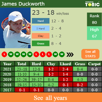 Duckworth has a solid record in the last 10 years having won 60% of his matches (292-191). 12-8 on hard in 2021. In connection with his performance on the same surface of this event, Duckworth has a composed 185-111 win-loss record in the last years on hard.