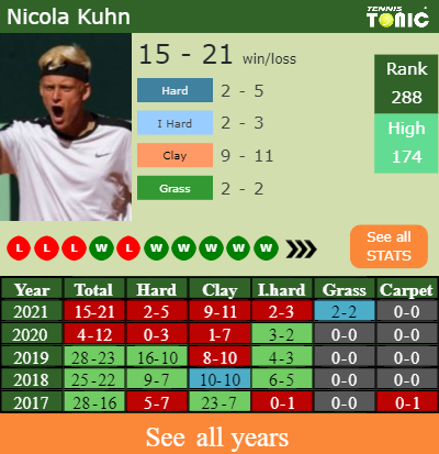 Kuhn has an aggregate 15-21 win-loss record in 2021, 9-11 on clay (See FULL STATS).