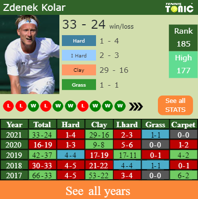 Kolar has a winning win-loss record in the last 6 years having won 58% of his matches (238-172). 29-16 on clay in 2021. Regarding his performance on the same surface of this event, Kolar has an aggregate170-104 win-loss record in the last 6 years on clay.