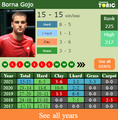 Borna has an aggregate 15-15 win-loss record in 2021, 8-5 on hard (See FULL STATS).