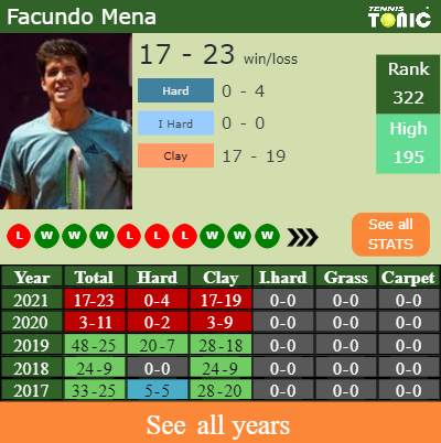 Mena has a winning win-loss record in the last 9 years having won 58% of his matches (331-238). 17-19 on clay in 2021. Talking about his performance on the same surface of this competition, Mena has a compiled283-201 record in the last 9 years on clay.