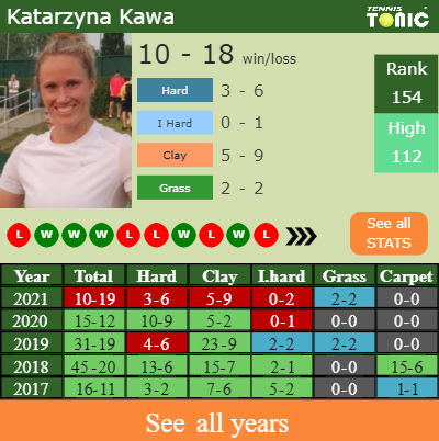 In terms of her career, Katarzyna has an overall 222-159 record. She has a negative 14-18 record on indoor hard courts.