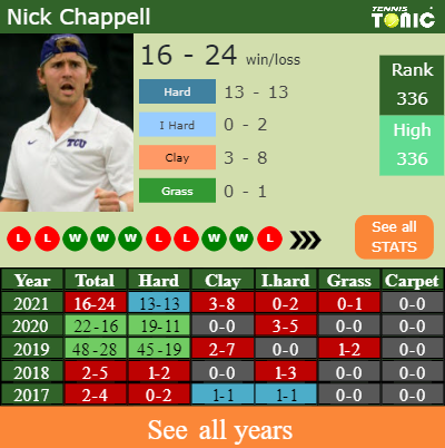 Nick has a composed 16-24 win-loss record in 2021, 0-2 on indoor hard courts (See FULL STATS).