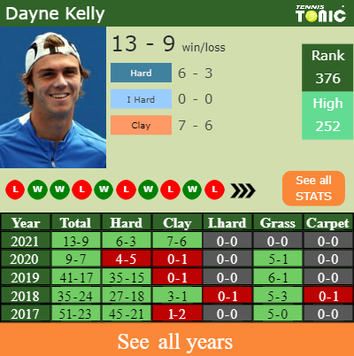 Kelly has a compiled 13-9 win-loss record in 2021, 0-0 on indoor hard courts (See FULL STATS).