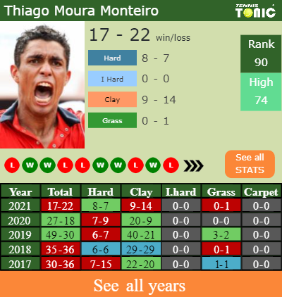 The Brazilian has an aggregate 17-22 win-loss record in 2021, 9-14 on clay (See FULL STATS).