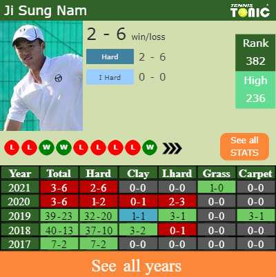 Talking about his overall career, Sung Nam has an overall 225-148 record. He has a negative 8-10 record on indoor hard courts.