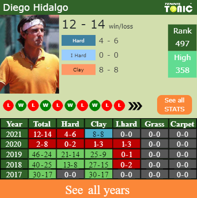 Hidalgo has an overall 12-14 win-loss record in 2021, 8-8 on clay (See FULL STATS).