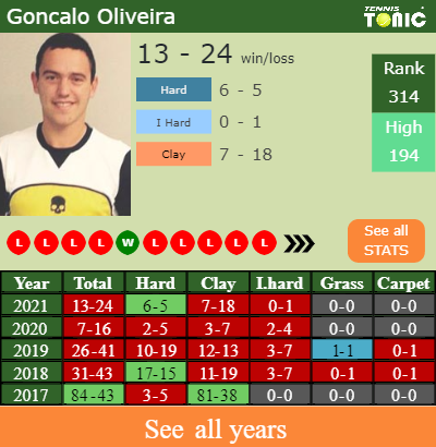 The Portuguese has an aggregate 13-24 win-loss record in 2021, 7-18 on clay (See FULL STATS).