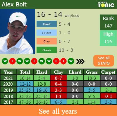 Bolt has an overall 16-14 win-loss record in 2021, 1-0 on indoor hard courts (See FULL STATS).