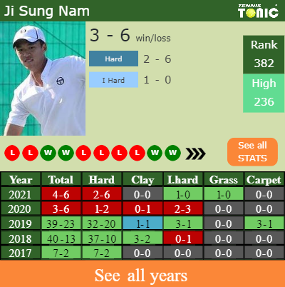 Sung Nam has a compiled 4-6 win-loss record in 2021, 1-0 on indoor hard courts (See FULL STATS).