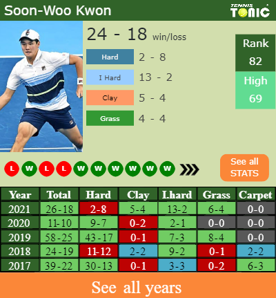 The Korean has an aggregate 26-18 win-loss record in 2021, 13-2 on indoor hard courts (See FULL STATS).