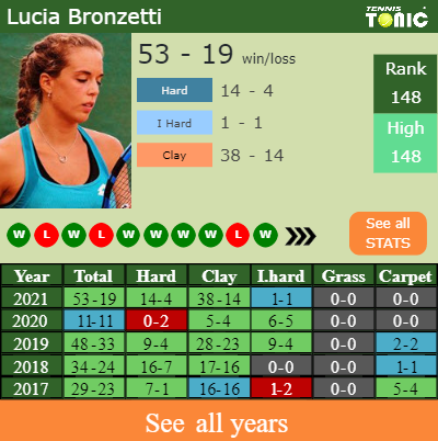 Bronzetti has a solid match record in the last 6 years having won 61% of her matches (195-124). 1-1 on indoor hard courts in 2021. In connection with her performance on the same surface of this competition, Bronzetti has an overall18-13 record in the last 6 years on indoor hard courts.