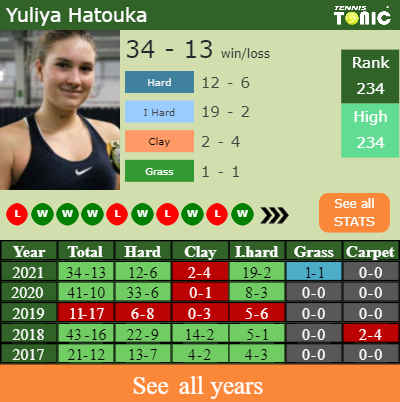 Hatouka has a compiled 34-13 win-loss record in 2021, 19-2 on indoor hard courts (See FULL STATS).