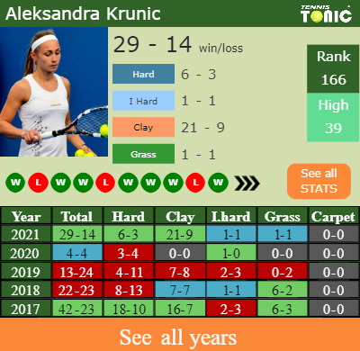 Krunic has a favorable match record in the last 10 years having won 57% of her matches (263-200). 1-1 on indoor hard courts in 2021. Regarding her performance on the same surface of this competition, Krunic has a composed 35-23 win-loss record in the last years on indoor hard courts.