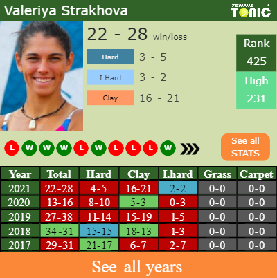 Strakhova has an aggregate 22-28 win-loss record in 2021, 2-2 on indoor hard courts (See FULL STATS).
