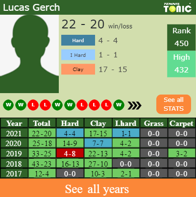 Gerch has a solid record in the last 5 years having won 60% of his matches (135-90). 17-15 on clay in 2021. Regarding his performance on the same surface of this event, Gerch has a compiled83-48 win-loss record in the last 5 years on clay.
