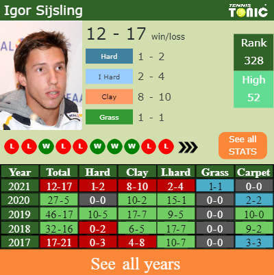Sijsling has a compiled 12-17 win-loss record in 2021, 8-10 on clay (See FULL STATS).