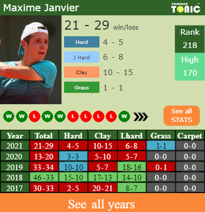 Janvier has a winning win-loss record in the last 8 years having won 55% of his matches (283-236). 6-8 on indoor hard courts in 2021. Regarding his performance on the same surface of this event, Janvier has a composed54-59 win-loss record in the last 8 years on indoor hard courts.