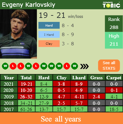 Evgeny has a composed 19-21 win-loss record in 2021, 8-9 on indoor hard courts (See FULL STATS).