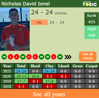 David Ionel has a solid match record in the last 4 years having won 60% of his matches (74-50). 24-24 on clay in 2021. Regarding his performance on the same surface of this event, David Ionel has an overall58-40 win-loss record in the last 4 years on clay.