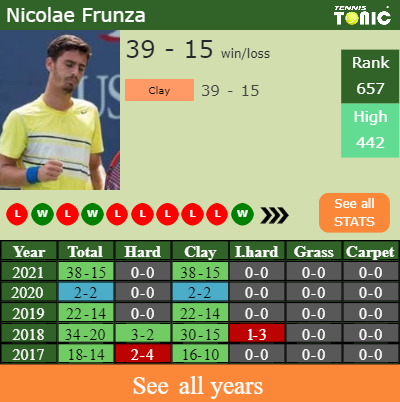 Frunza has an aggregate 38-15 win-loss record in 2021, 38-15 on clay (See FULL STATS).