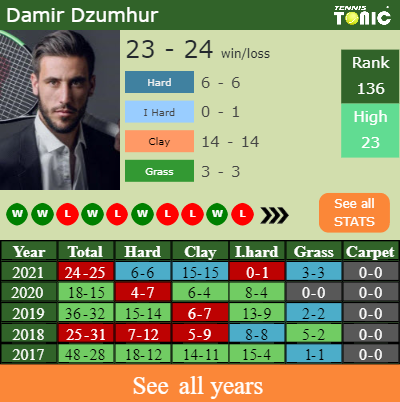 The Bosnian has a compiled 24-25 win-loss record in 2021, 15-15 on clay (See FULL STATS).