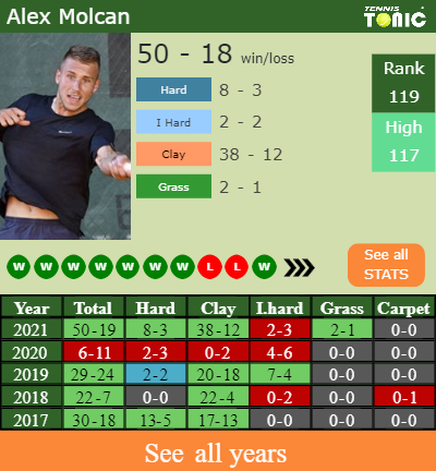 Molcan has a solid win-loss record in the last 8 years having won 62% of his matches (184-111). 38-12 on clay in 2021. Regarding his performance on the same surface of this tournament, Molcan has an aggregate116-65 record in the last 8 years on clay.