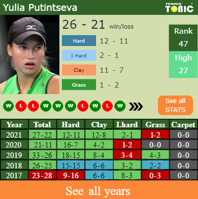 Yulia has an overall 27-22 win-loss record in 2021, 2-1 on indoor hard courts (See FULL STATS).
